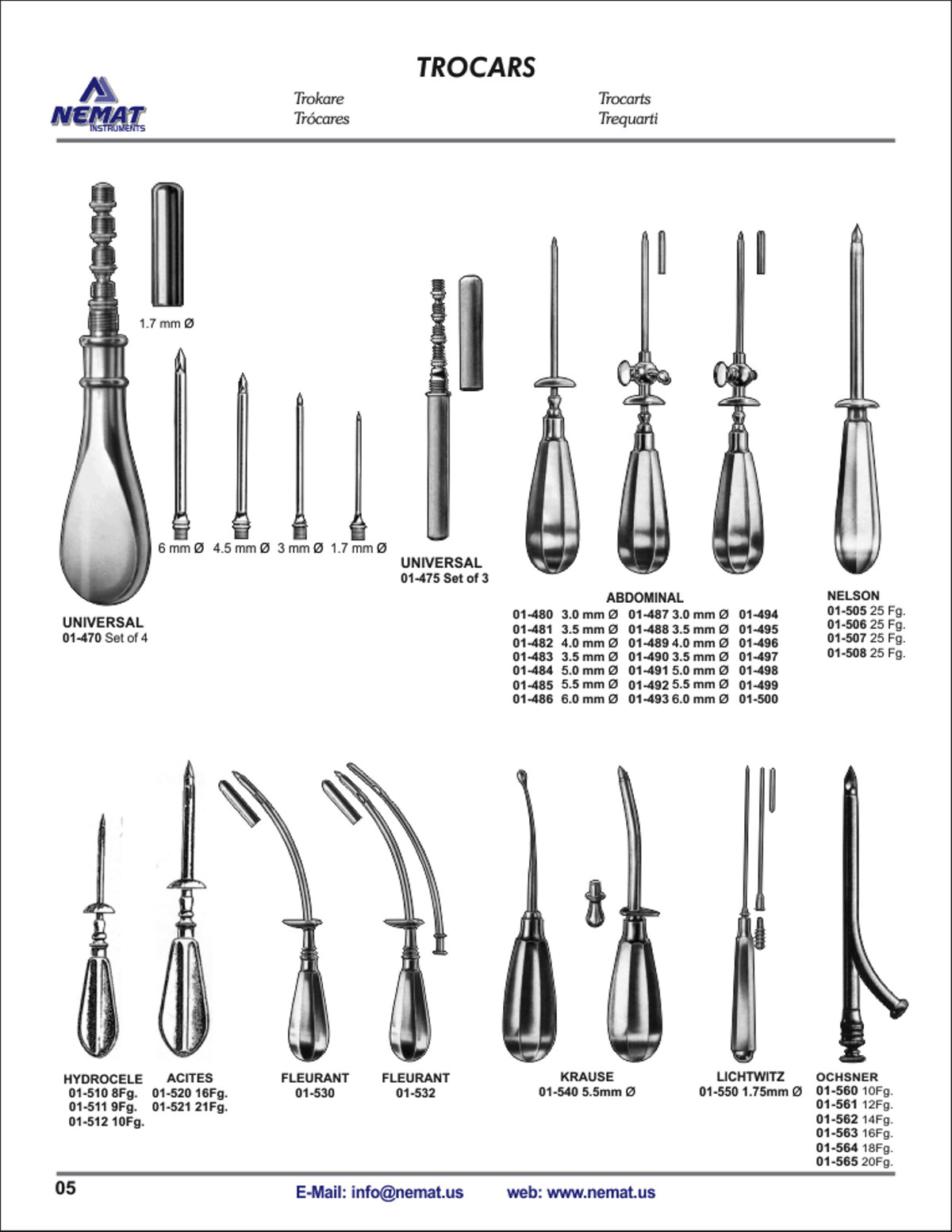 Buy Trocars in all sizes / Fig.No.s Universal Trocars Set Of 4, Universal Trocars, Abdominal Trocars, Nelson Trocars, Hydrocele Trocars, Acites Trocars, Fleurant Trocars, Krause Trocars, Lichtwitz Trocars,