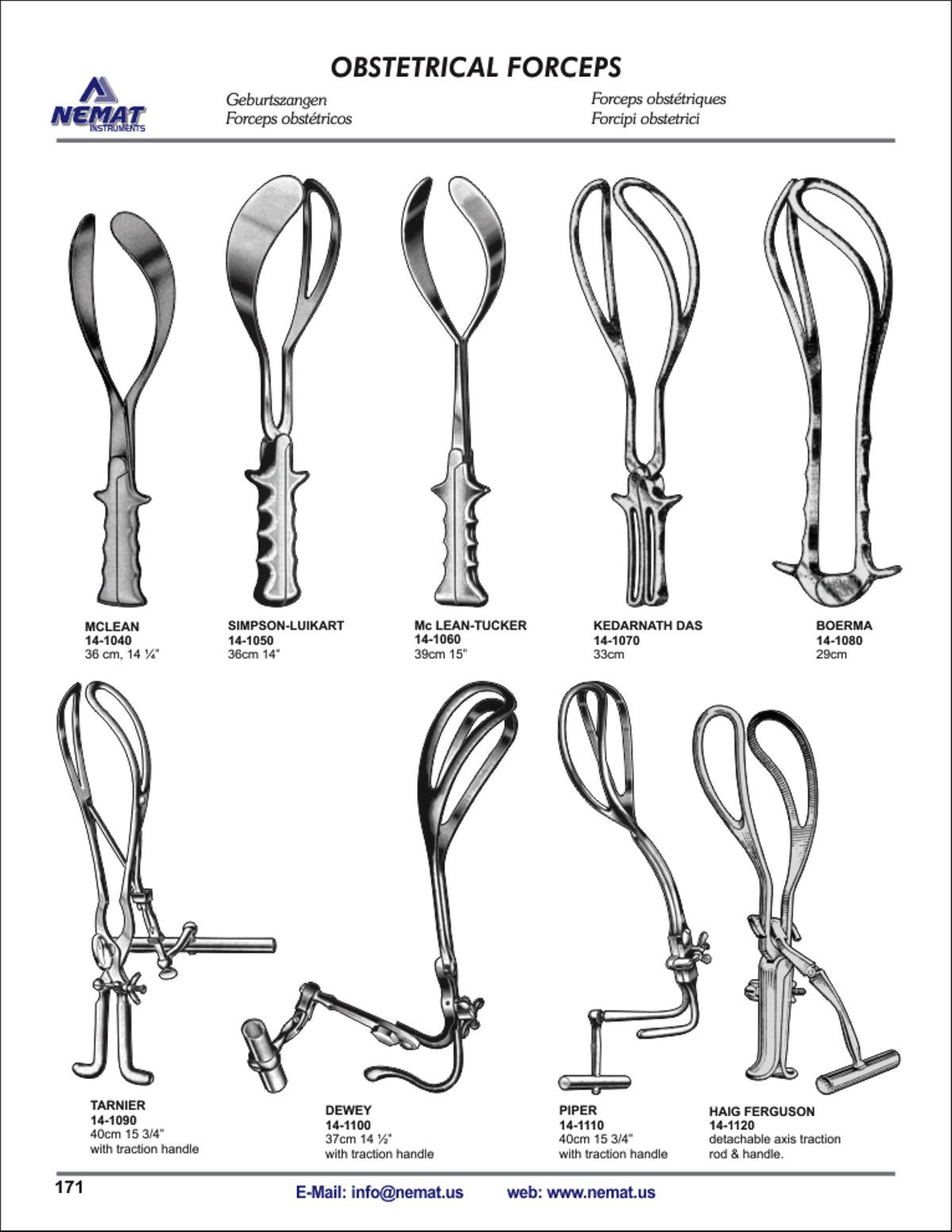 Mclean 36cm, Simpson-Luikart 36cm, Mc Lean-Tucker 39cm, Kedarnath Das 33cm, Boerma 29cm, Tarnier 40cm with Traction Handle, Dewey 37cm with Traction Handle, Piper 40cm with Traction Handle, Haig Ferguson Detachable Axis Traction Rod & Handle.