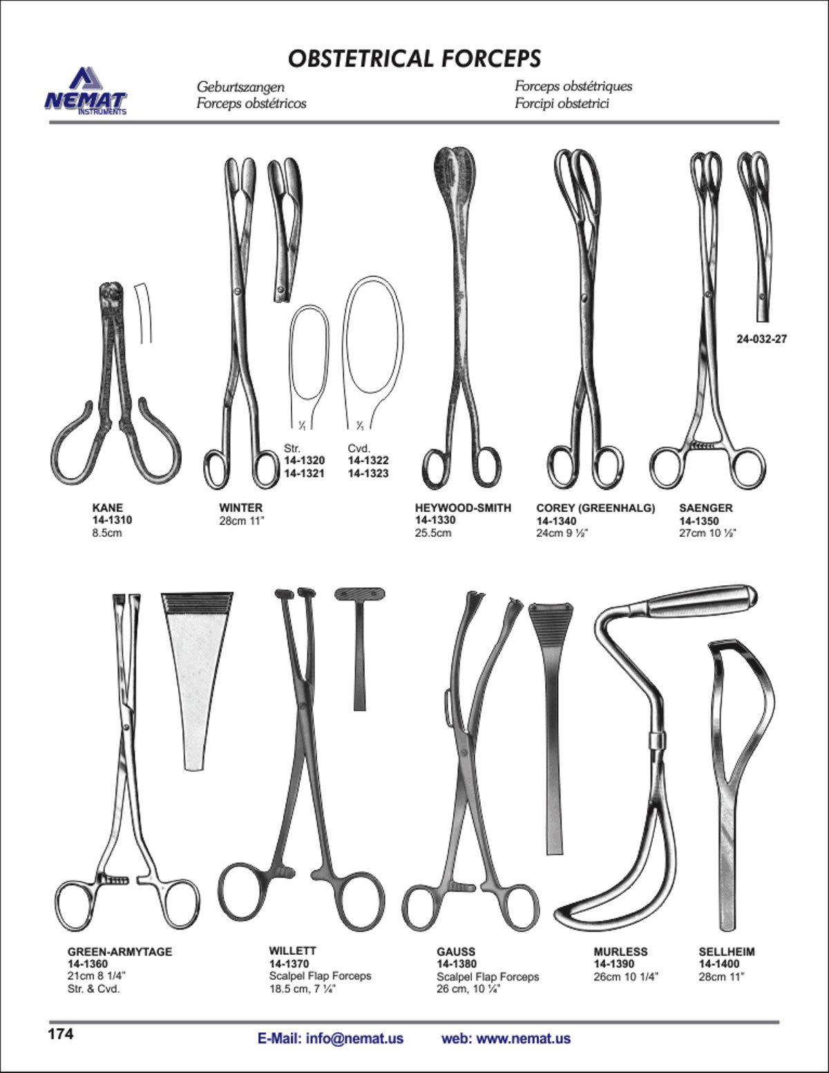 Obstetrical Forceps, Kane 8.5cm, Winter 28cm Straight, Winter 28cm straight, Winter 28cm curved, Winter 28cm curved, Heywood-Smith 25.5cm, Corey (Greenhalg) 24cm, Saenger 27cm, Green-Armytage 21cm straight & curved, Willett Scalpel Flap Forceps 18.5cm, Gau